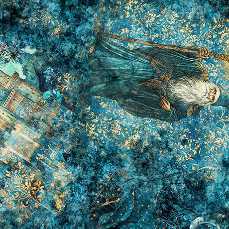 Tossed medieval wizards, dragons, castles, and mythical creature on teal background from the Folklore collection by Dan Morris from Quilting Treasures (31643 -Q).